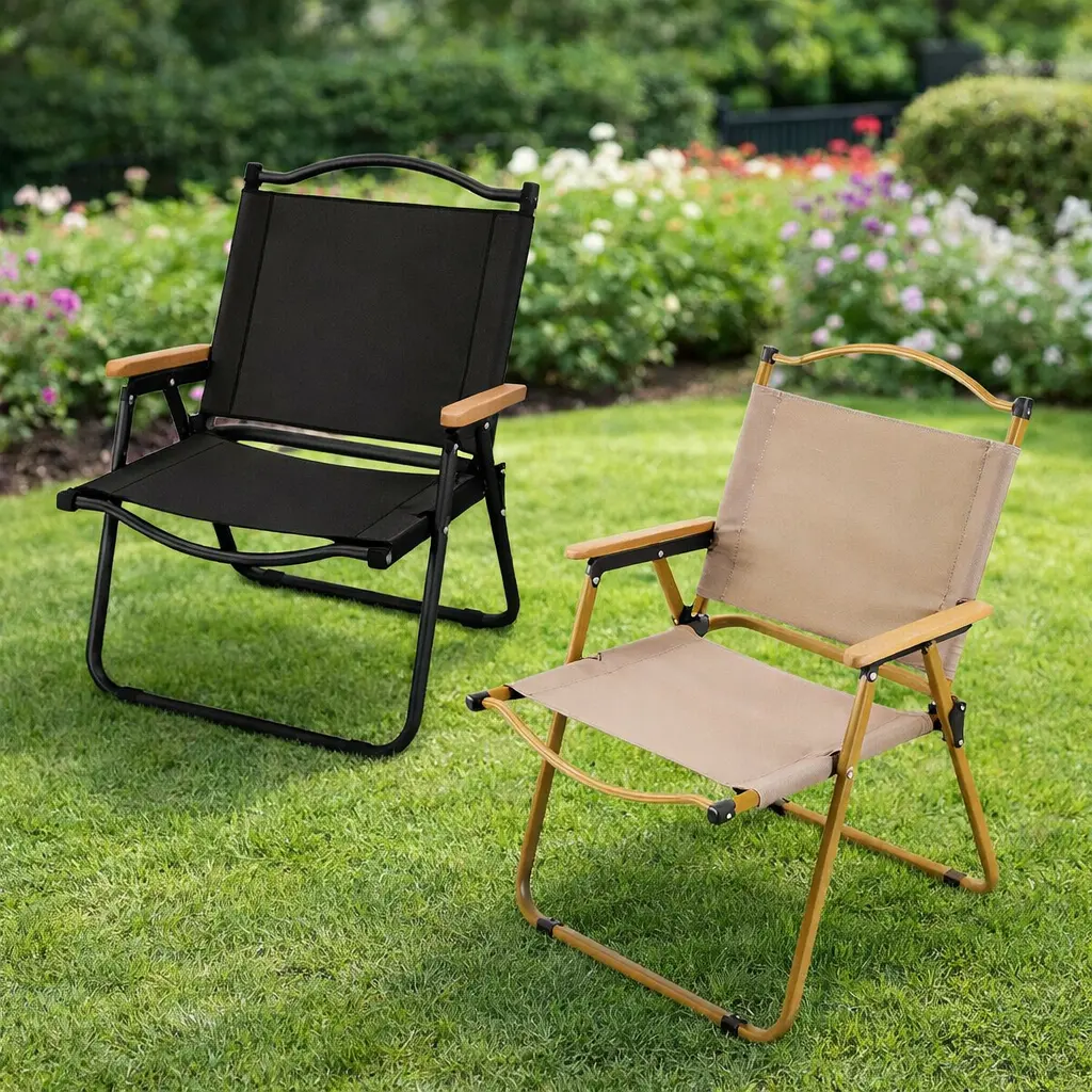 Cuenta con una estructura de hierro liviano y resistente, que brinda gran estabilidad sin sacrificar facilidad de transporte. Su lona de alta calidad es firme y cómoda, ideal para uso prolongado, mientras que los posabrazos de madera aportan un toque cálido y elegante.